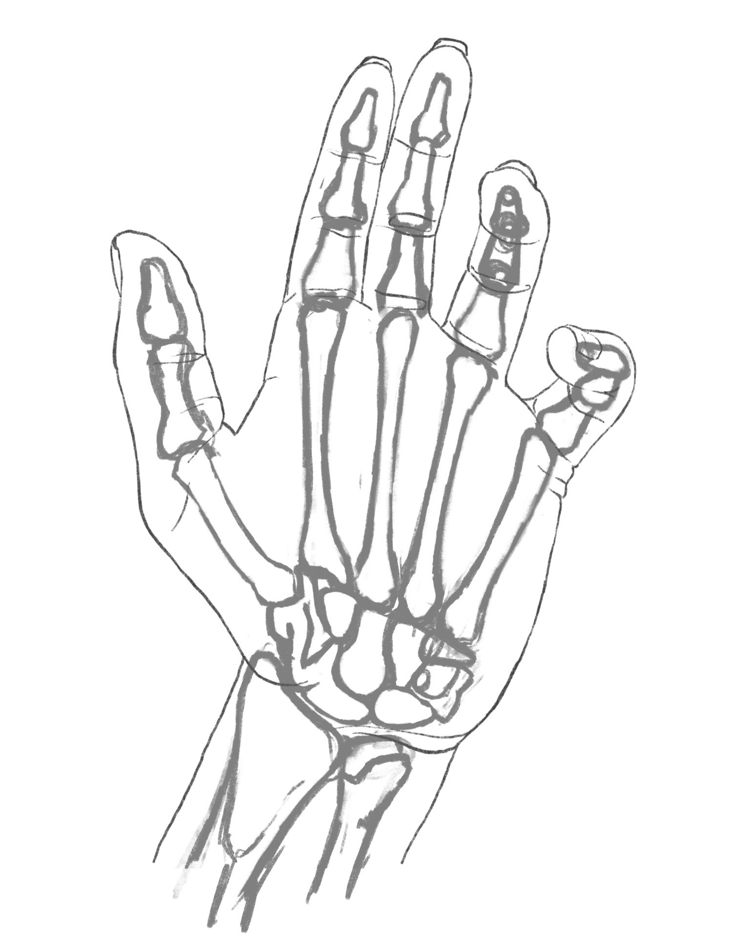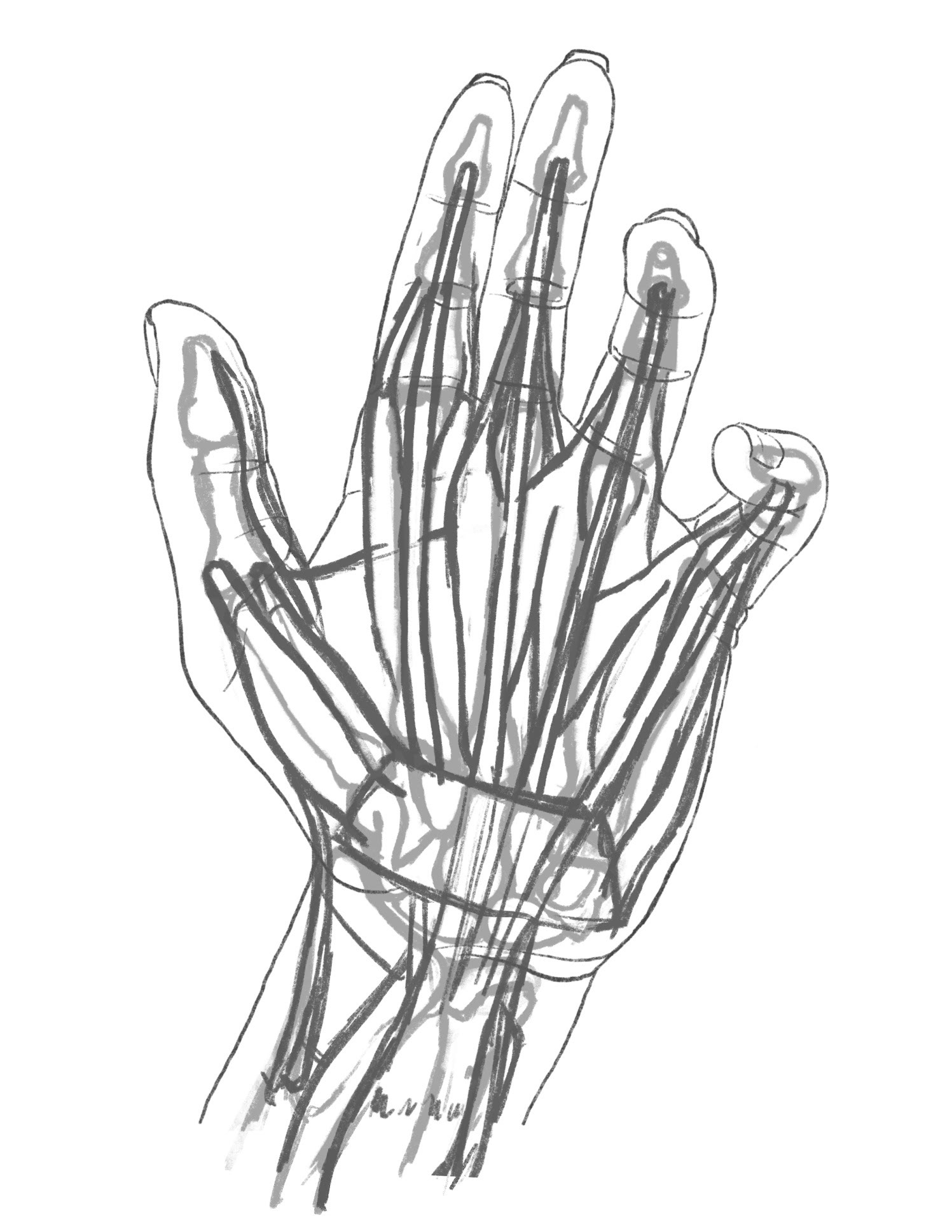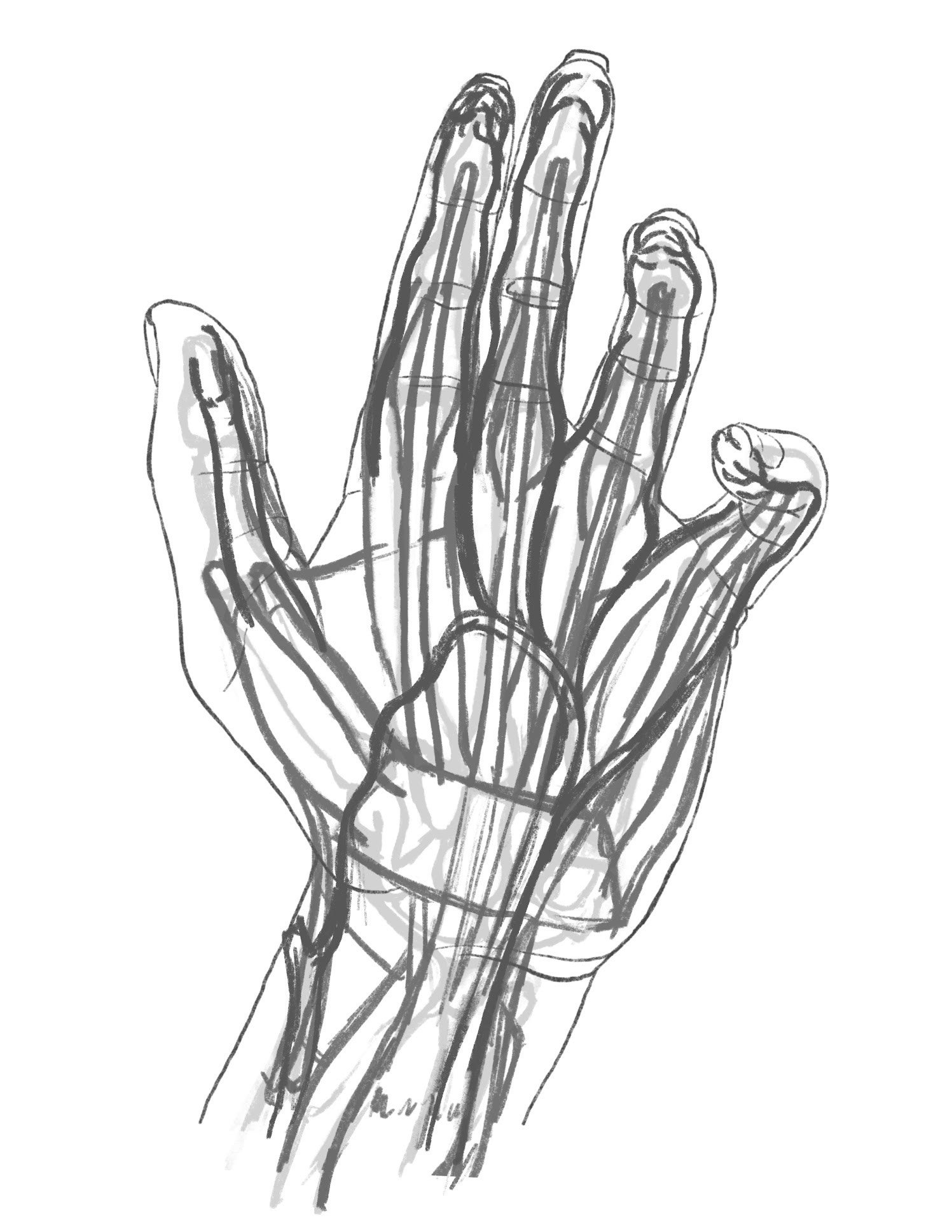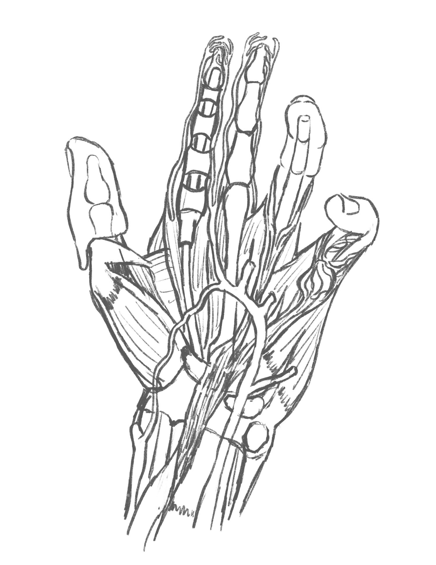 Purpose: To create a detailed black-and-white ink illustration of the hand, highlighting five different anatomical structures, along with an infographic explaining the symptoms, presentation, and causes of Dupuytren’s disease.