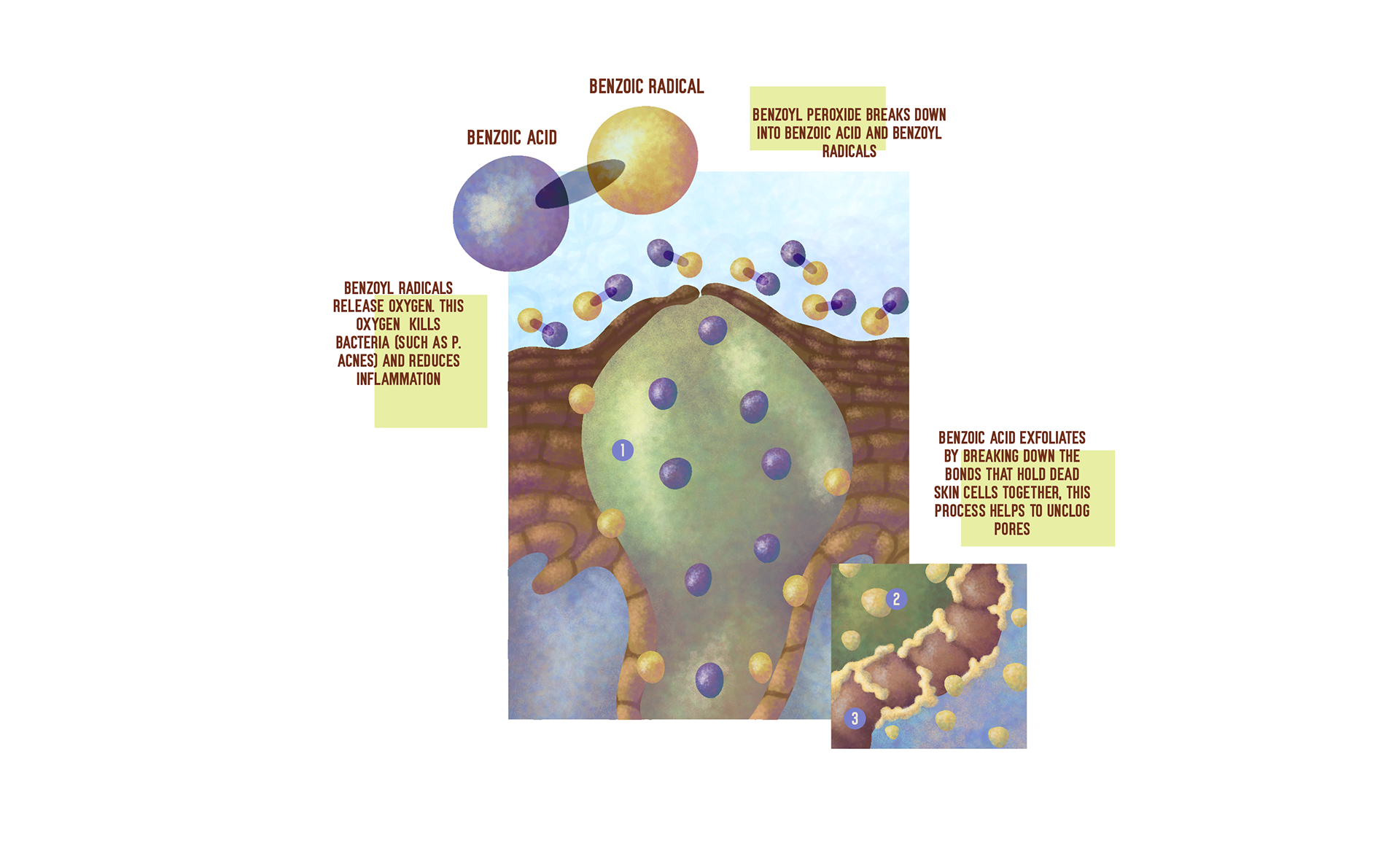 Purpose: To develop a series of illustrated infographics that visualize the complex chemical processes triggered in the skin by commonly used topical treatments.